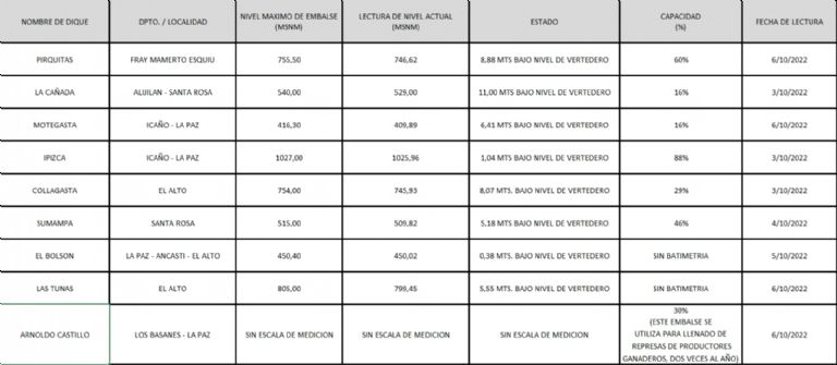 De igual manera, se sumó la administración del dique Arnoldo Castillo, ubicado en Los Basanes, departamento La Paz, que se encuentra en una capacidad del 30%. Este embalse se utiliza para llenado de represas de productores ganaderos dos veces al año.