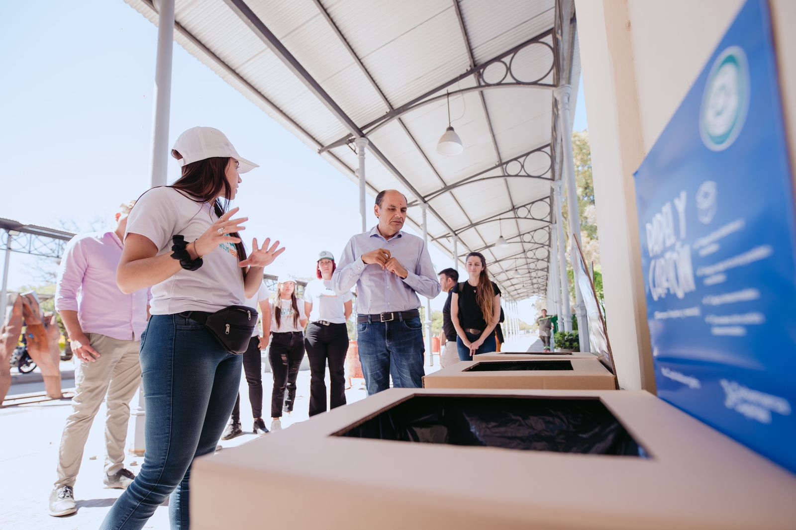 Se colocó para ello un sistema de cestos diferenciados elaborados de material reciclado, así los empleados municipales y visitantes pueden separar papel, plástico, vidrios, etc. Además, se instalaron colilleros para recibir colillas de cigarrillos y luego poder tomarlas como materia prima, para transformarlas en ladrillos de construcción.