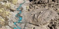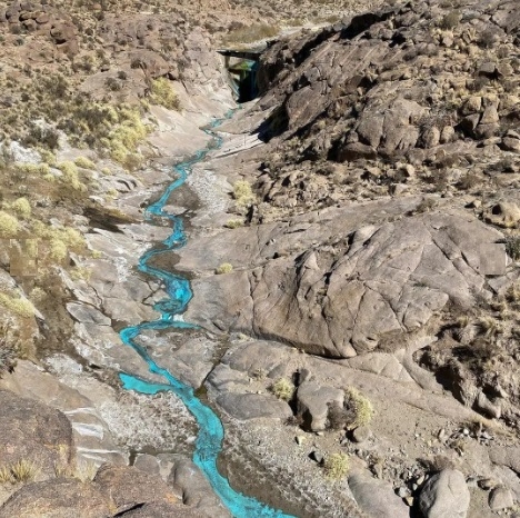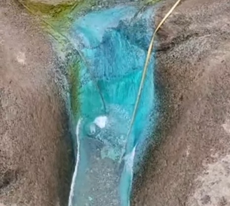 La presencia de cobre en el lugar combinado con el agua que emana de entre las piedras de la montaña, hace que el mineral se sulfate y adquiera el color turquesa intenso.