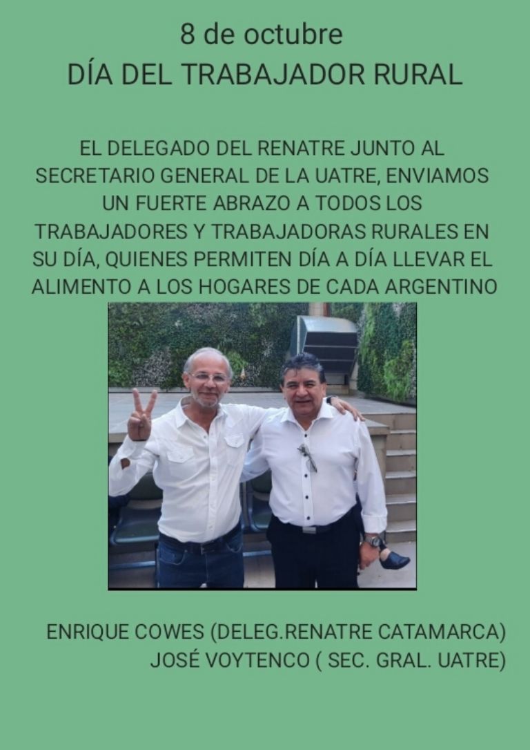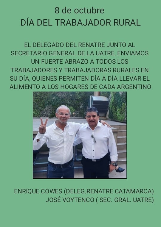 Salutaciones de Enrique Cowes, delegado de RENATRE en Catamarca y de José Voytenco, secretario general de UATRE.