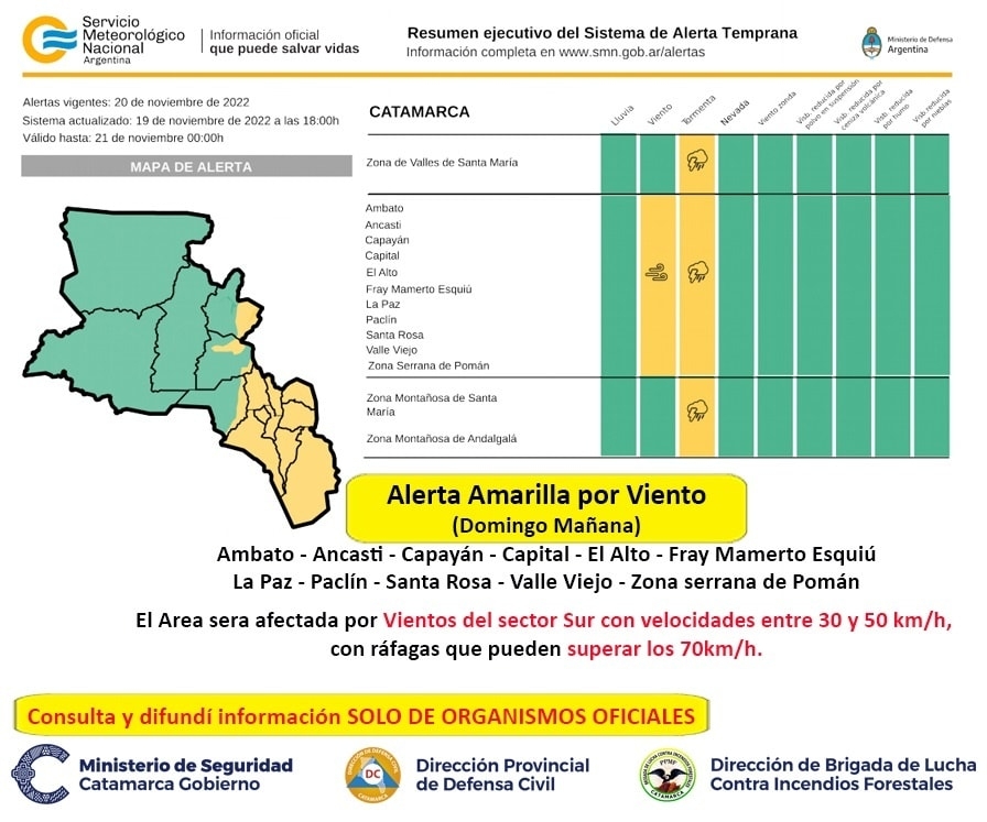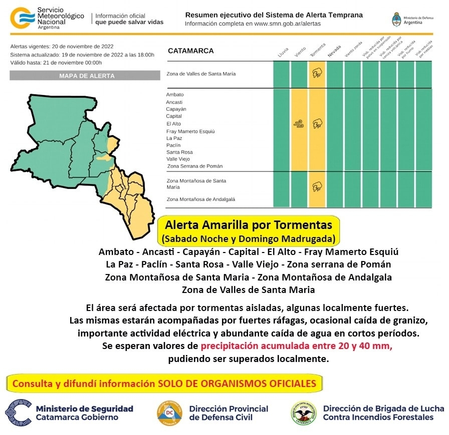 El fenómeno afectará los Departamentos: La Paz, Ancasti, Ambato, El Alto, Santa Rosa, Capayán, Fray Mamerto Esquiú, Capital, Paclín, Valle Viejo, zonas Montañosa de Santa Maria, Pomán y Andalgala.