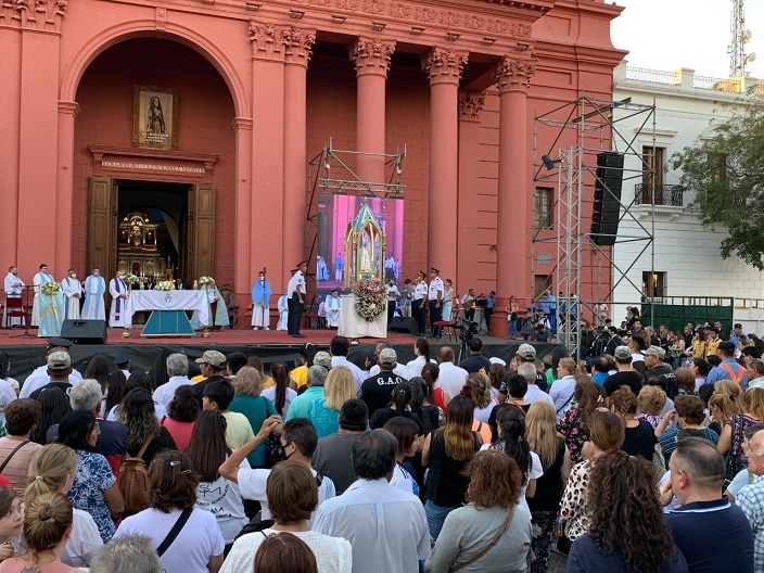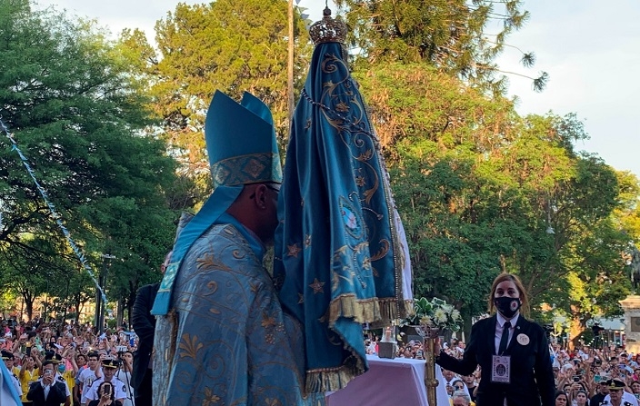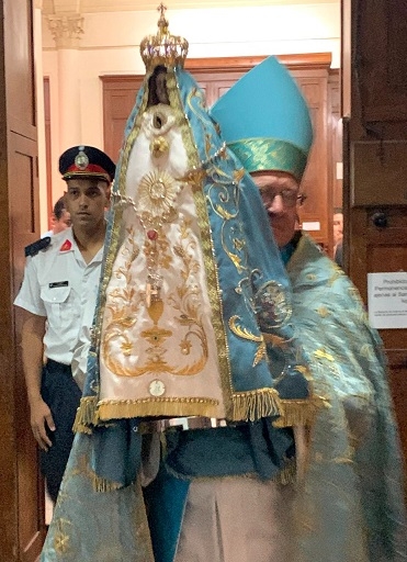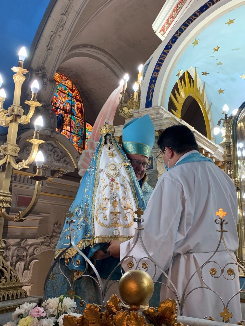 La ceremonia, en la que se sucedieron los gestos de amor, fe y profunda devoción a la Madre Morena, fue presidida por el obispo diocesano, Mons. Luis Urbanc, quien la llevó en brazos, acompañado por el rector de la Catedral Basílica y Santuario mariano, padre Gustavo Flores, y sacerdotes del clero catamarqueño.