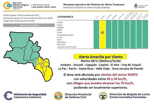 Desde el Servicio Metereológico Nacional, informaron un alerta amarilla, a la zona Este y Centro de la Provincia de Catamarca, afectando a 11 departamentos.