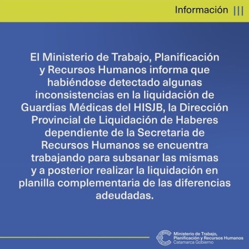 "El Ministerio de Trabajo, Planificación y Recursos Humanos informa que habiéndose detectado algunas inconsistencias en la liquidación de Guardias Médicas del HISJB, la Dirección Provincial de Liquidación de Haberes dependiente de la Secretaria de Recursos Humanos se encuentra trabajando para subsanar las mismas y a posterior realizar la liquidación en planilla complementaria de las diferencias adeudadas", informó el ministerio.