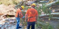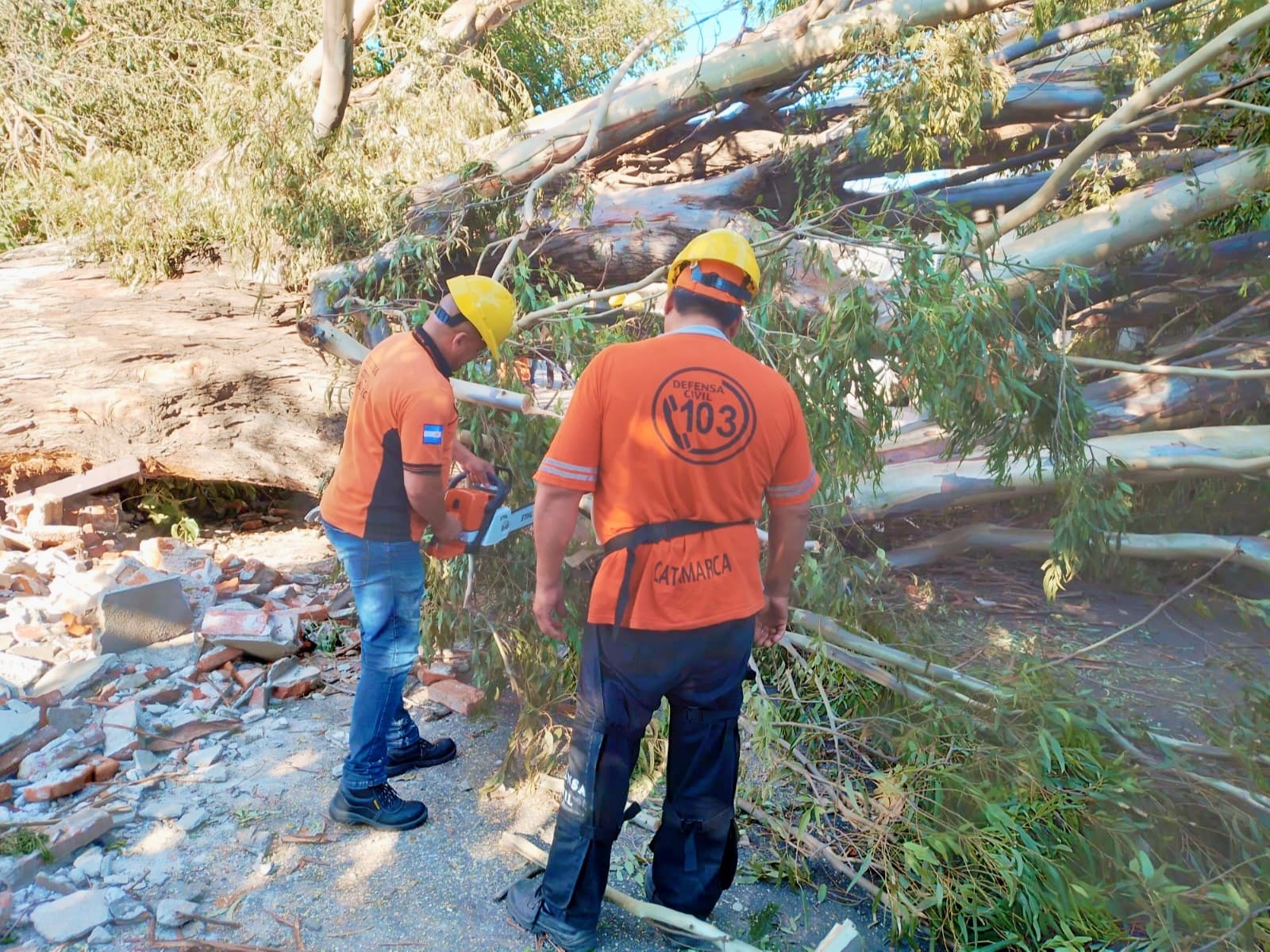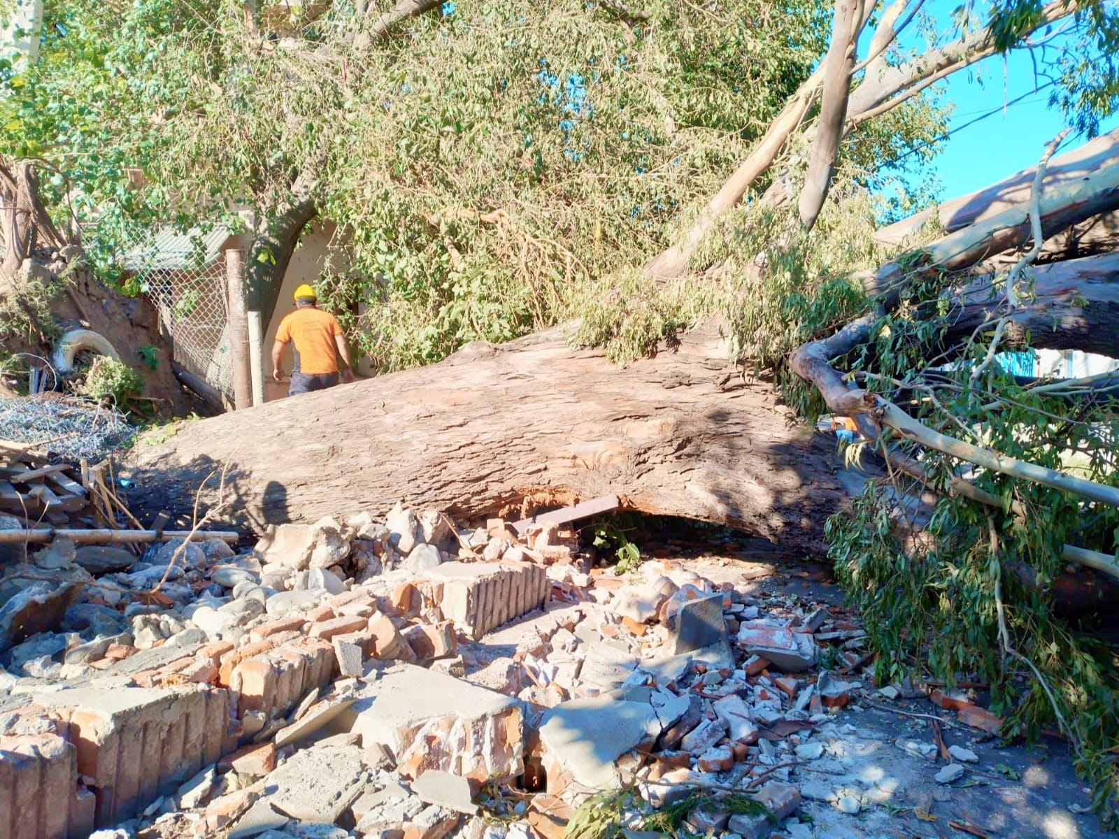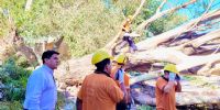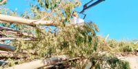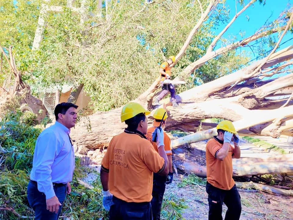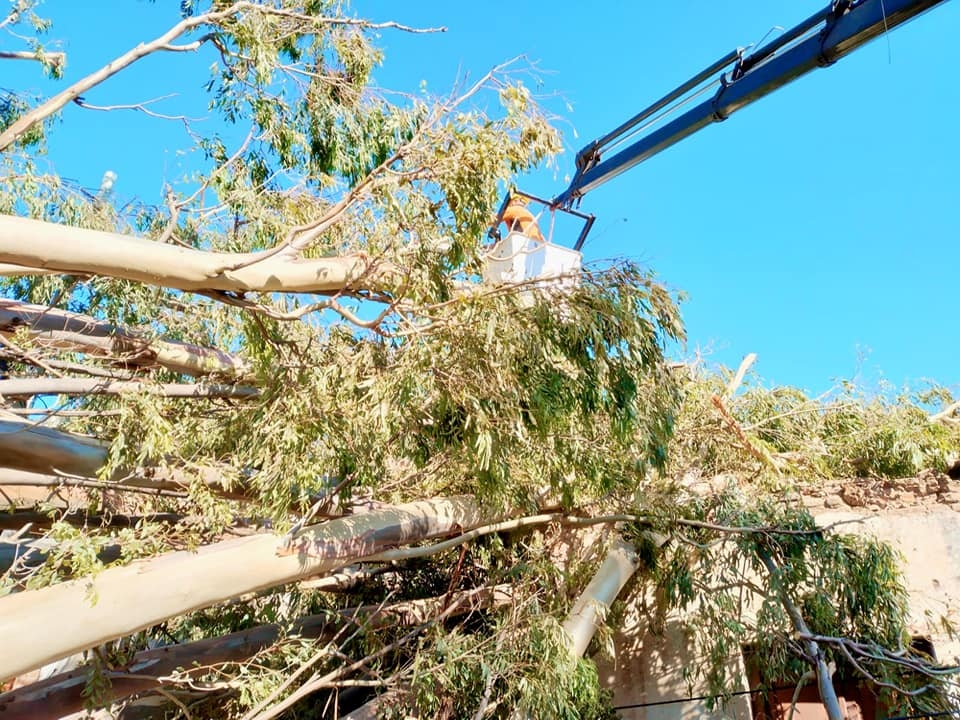 Junto a personal y equipo de Ec Sapem Energía y Municipalidad de la Capital, el organismo trabaja en el corte, reducción y quite de árbol de gran porte que cayó detrás del Hogar Escuela, sobre Calle Juan Archeverroa.