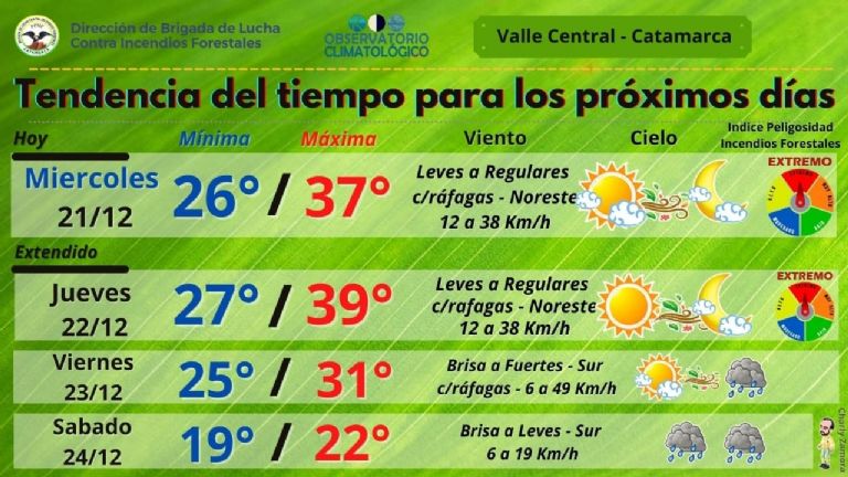 En tanto en el valle central, el día Jueves 22, tendremos la temperatura más alta de toda la semana. El termómetro marcará 27 grados de mínima y 39 grados la máxima.