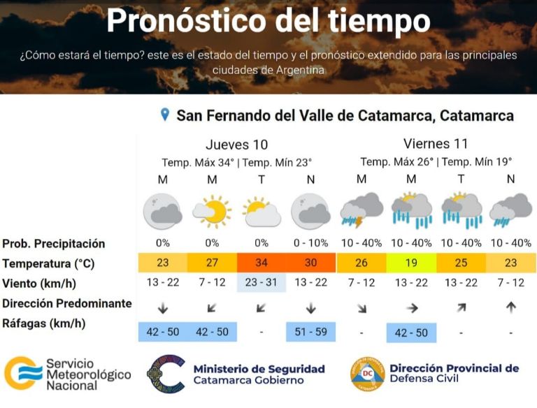 De acuerdo al pronóstico extendido del Servicio Meteorológico Nacional, se esperan temperaturas mínimas de 19° y máximas de 30°, vientos de entre 7 y 31 km/h., ráfagas de entre 42 y 59 km/h y, una probabilidad de ocurrencia de lluvias y tormentas aisladas de entre 0% y 40%.
