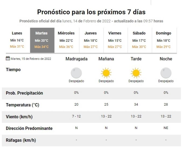 El Servicio Meteorológico Nacional pronostica una semana con altas temperaturas. No se visualizan lluvias.