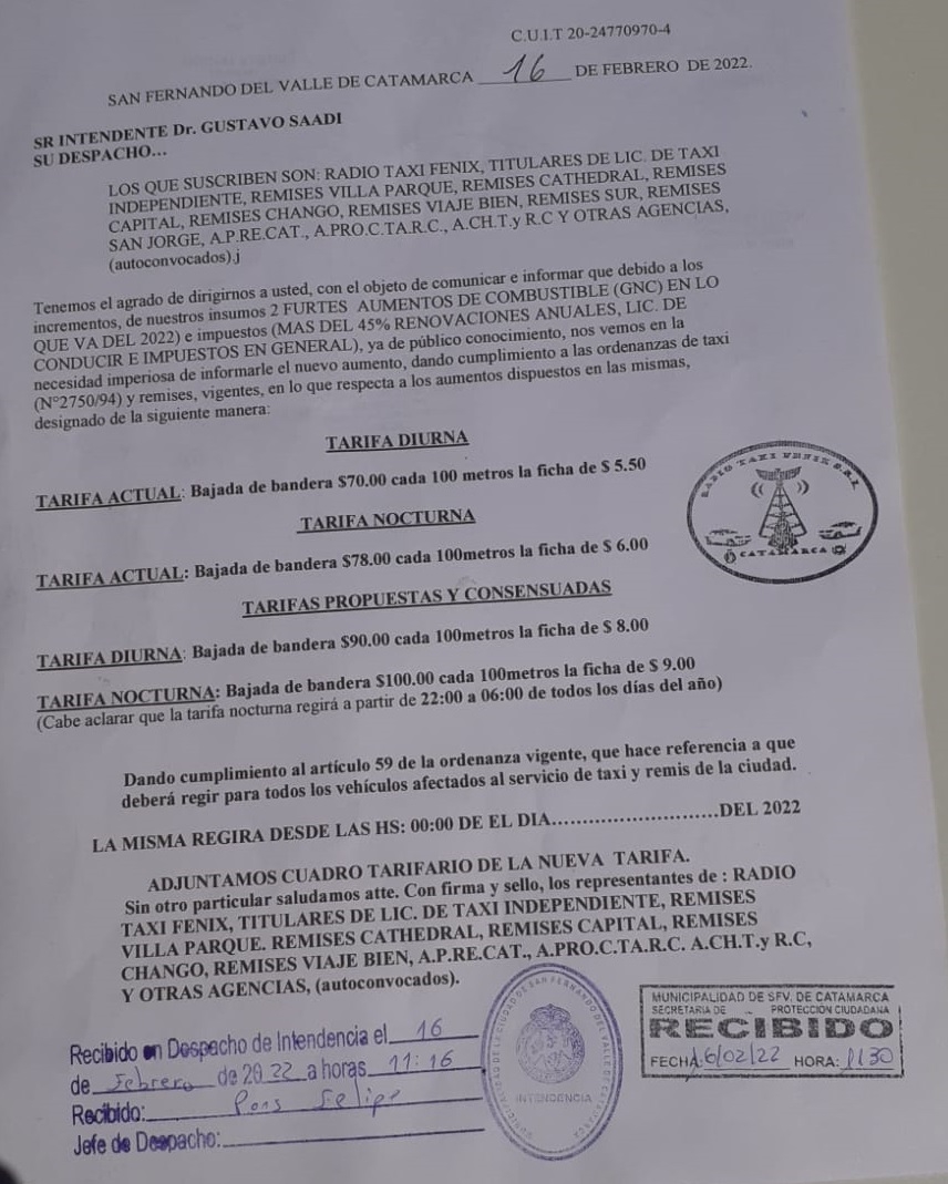 El pedido está firmado por Radio Taxi Fenix; Titulares de Licencia de Taxis Independientes; Remises Villa Parque; Remises Cathedral, Remises Capital; Remises Chango, Remises Viaje Bien; APRECAT; APROCTARC; ACHTyRC; y otras agencias (autovoncocadas).