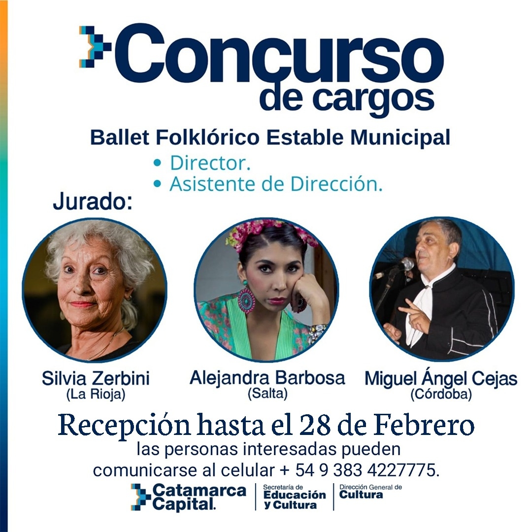 La Dirección General de Cultura Municipal informa a las personas interesadas en participar del concurso abierto de antecedentes y oposición para los cargos de Dirección y Asistencia de Dirección del Ballet Estable Folclórico Municipal que por motivos de fuerza mayor se han modificado las fechas establecidas para el mismo.
