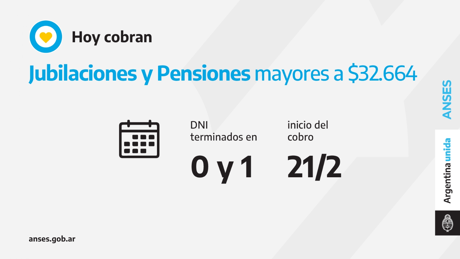 Las sucursales bancarias habilitadas atenderán por ventanilla a jubilados, jubiladas, pensionados y pensionadas con documentos terminados en 0 y 1 cuyos haberes SUPEREN la suma de 32.664 pesos.