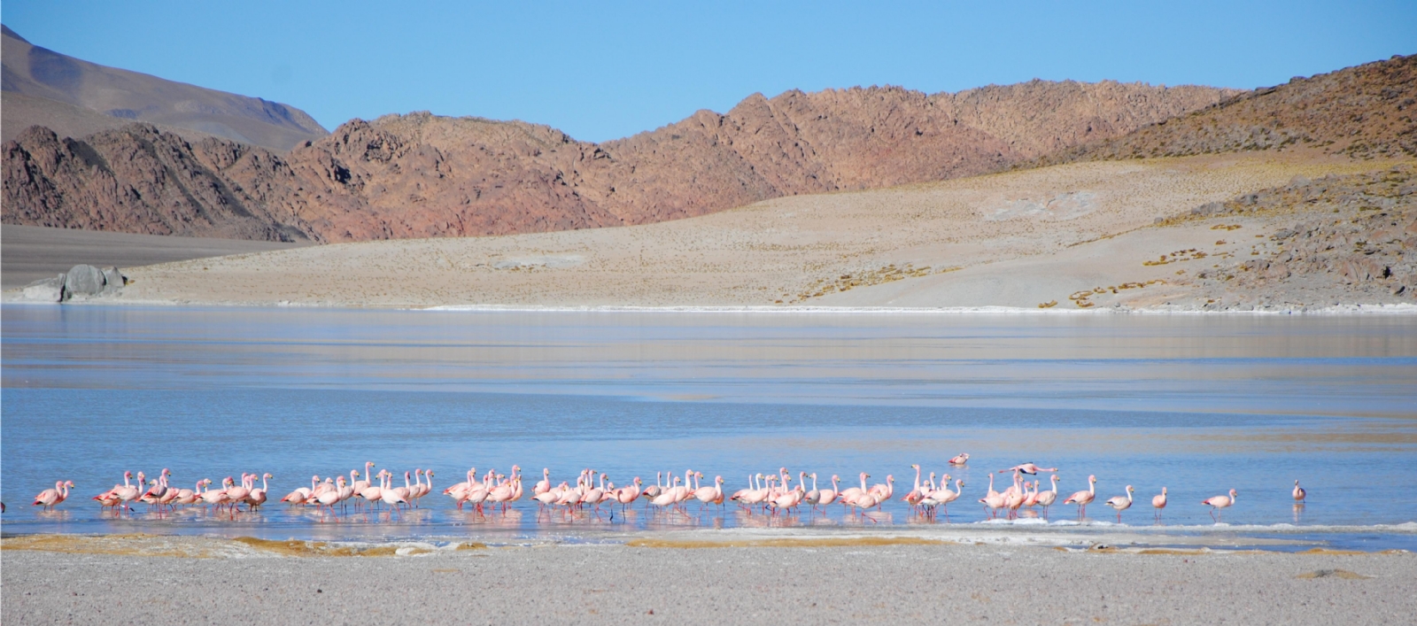 Luego de los 60 km que separan Antofagasta con El Peñón, se toma una huella entre arenales y pedregullo, a los 40 kms. Llegaremos a la Laguna Grande, un imponente espejo de agua que en los meses de verano se convierte en una de las mayores reservas mundiales de variedades de flamencos, se calcula que entre 18 y 25 mil aves de este tipo llegan a nuestra puna a nidificar, creando un marco de colores rosados que es difícil de explicar en líneas, siempre decimos que este tipo de paisajes solo se pueden dimensionar, viéndolos personalmente.