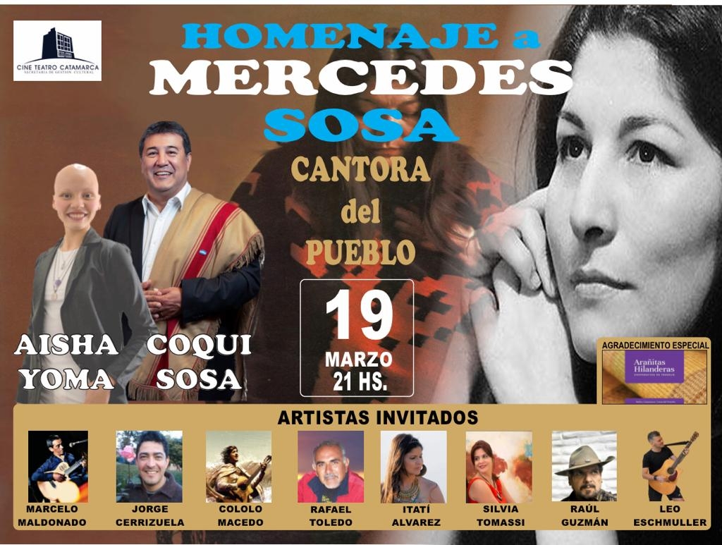 Continuando con la Gira Nacional, en el Mes de la Mujer, se presentara el “Homenaje a la Cantora del Pueblo”, en el Cine Teatro Catamarca, el día sábado 19 de marzo, a las 21 has. Un proyecto Itinerante que lleva a cabo el cantautor tucumano, Coqui Sosa (sobrino de Mercedes Sosa) llevando así la música y el pensamiento de la gran cantante