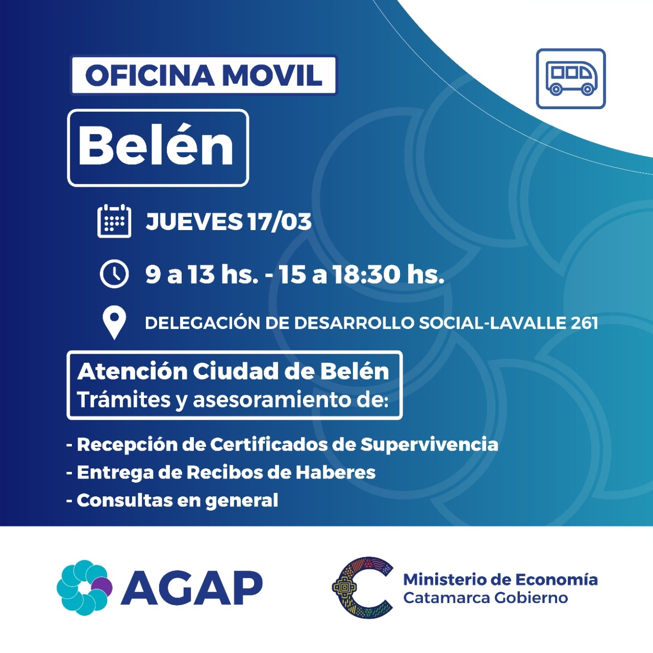 El próximo jueves 17 y viernes 18 de marzo, la Oficina móvil de la Administración General Asuntos Previsionales (AGAP) atenderá consultas de sus afiliados y beneficiarios en el Departamento Belén.