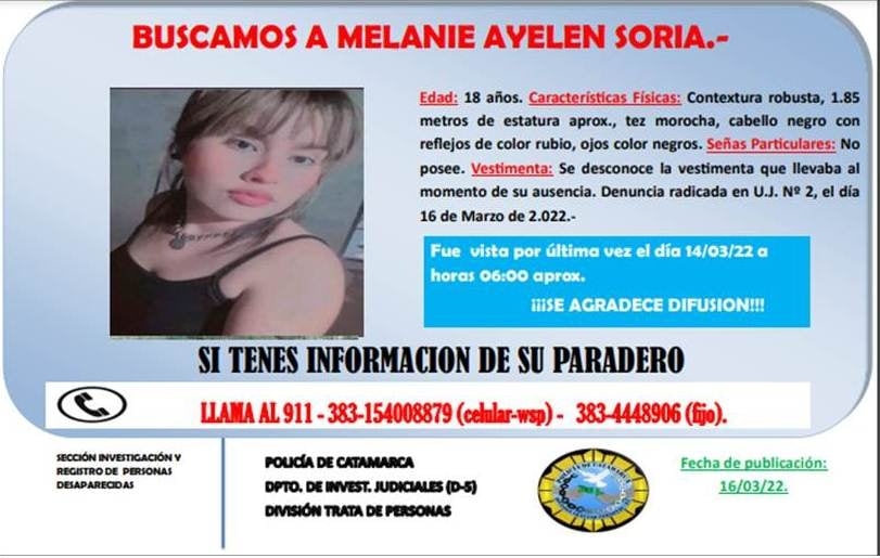 Su nombre es Melanie Ayelen Soria de 1,85 metros, contextura robusta, tez morocha, cabello negro con reflejos color rubio, y ojos color negro.