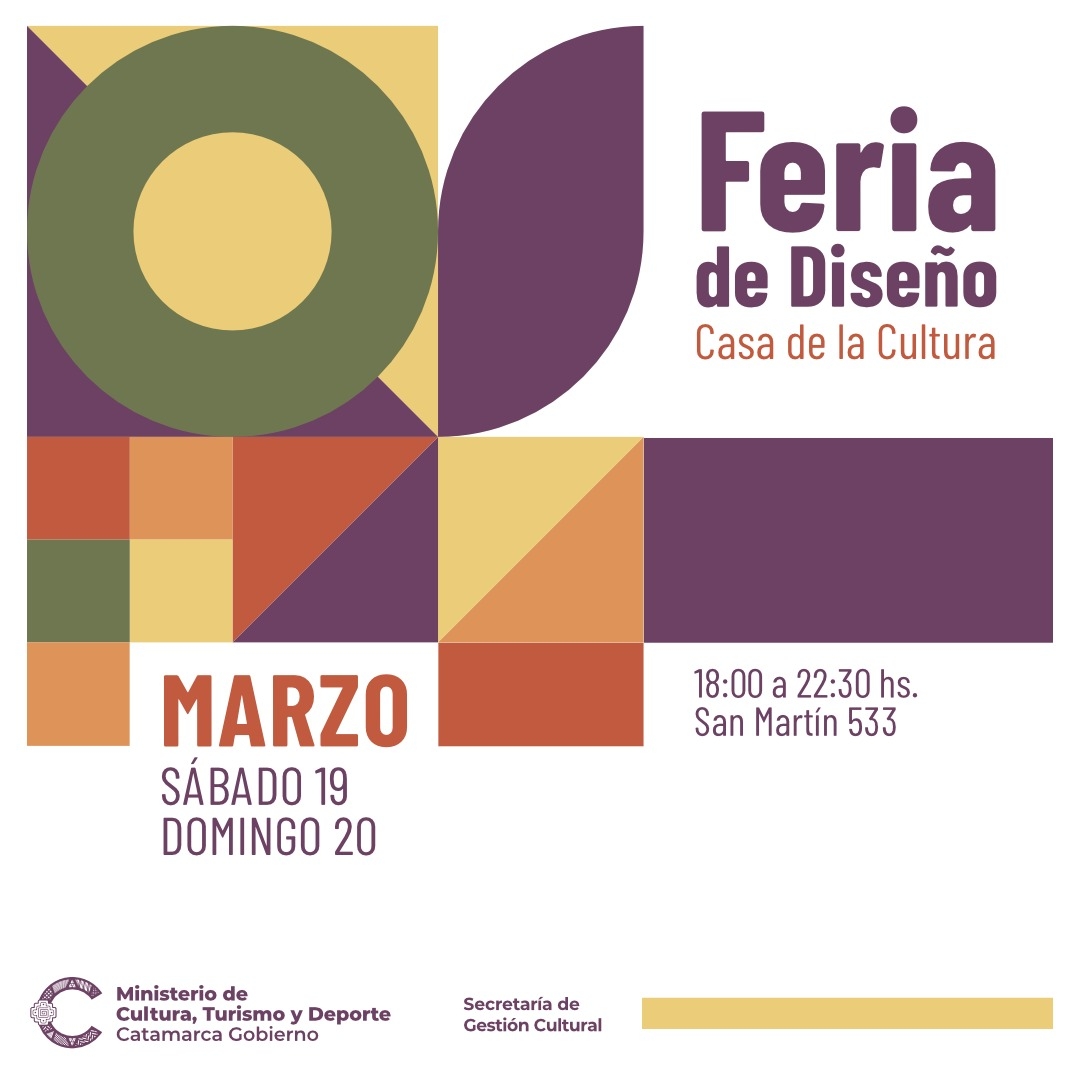 Este sábado 19 y domingo 20, entre las 18 y 22.30 horas, se realizará en la Casa de la Cultura (San Martín 533) la 4º edición de la Feria de Diseño que organiza la Secretaría de Gestión Cultural, del Ministerio de Cultura, Turismo y Deporte de Catamarca.