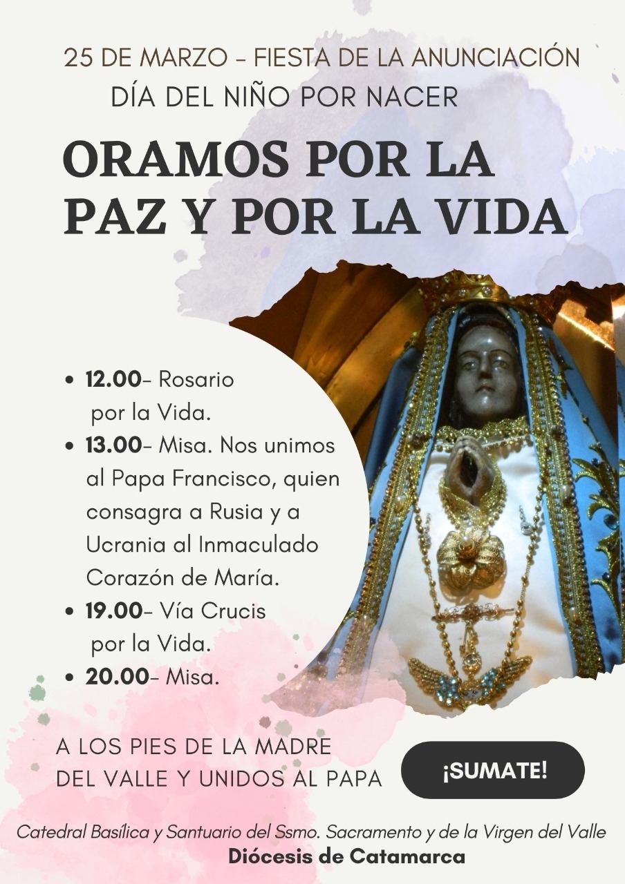 La Diócesis de Catamarca, junto con su pastor diocesano, Mons. Luis Urbanc, se une al Papa Francisco, quien el viernes 25 de marzo, fiesta de la Anunciación del Señor, consagrará a Rusia y a Ucrania al Inmaculado Corazón de María en la Basílica de San Pedro, durante una celebración solemne penitencial de Cuaresma, que tendrá lugar a las 17.00 (hora de Roma), 13.00 (hora de Argentina).