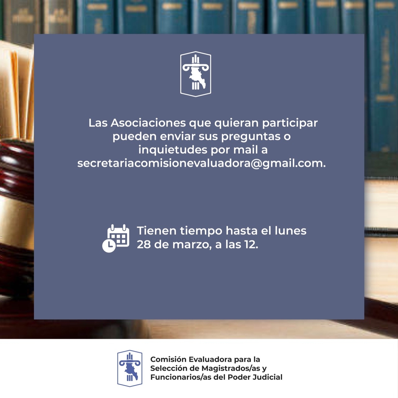 Desde la Comisión Evaluadora se invita a las asociaciones civiles y público en general a participar en esta instancia. Para ello, deben enviar sus preguntas –con nombre de la institución a la que representan y personería jurídica o nombre completo y DNI, si se trata de ciudadanos- al mail [email protected]. Tienen tiempo hasta el lunes 28, a las 12. También podrán presenciar la entrevista hasta dos personas por asociación.