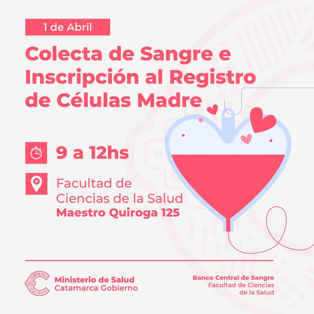 El Banco Central de Sangre, que depende del Ministerio de Salud de la Provincia, y la Facultad de Ciencias de la Salud de la UNCa, llevarán a cabo una Colecta de sangre e inscripción al registro de células madre, el día viernes 1 de abril de 9 a 12 horas, en dicha Facultad, con motivo de celebrarse el Día Nacional del Donante de Células Madre.