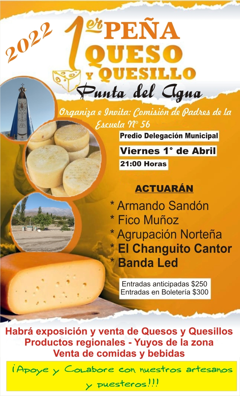 Este primero de abril la cultura se pone nuevamente de manifiesto en el norte de Fiambalá, dado que la Comisión de Padres de Alumnos de la Escuela N° 56 “Ciudad del Mar del Plata” de la localidad de Punta del Agua organiza la 1° Edición de la Peña denominada “QUESO Y QUESILLO”, la cual dará inicio a horas 21:00, para ello organizaron una importante cartelera de la que artistas del distrito de Fiambalá serán parte de un importante evento que ya comenzó a trascender con elogios en distintos puntos de la provincia y el país, por las características peculiar del mismo.