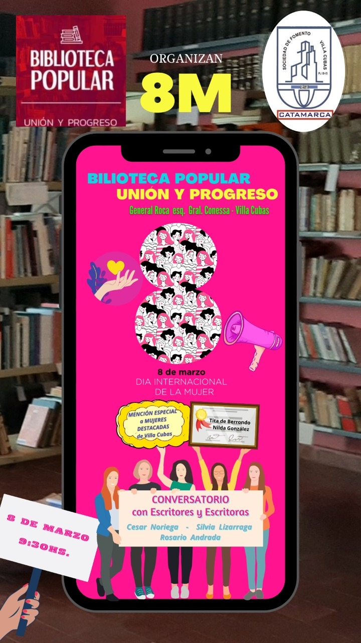 Como parte de la conmemoración por el Día Internacional de la Mujer, la Biblioteca Popular “Unión y Progreso” del barrio Villa Cubas, invita a la comunidad en general a participar de un conversatorio con escritoras y escritores catamarqueños, a llevarse a cabo este martes 8 de marzo.