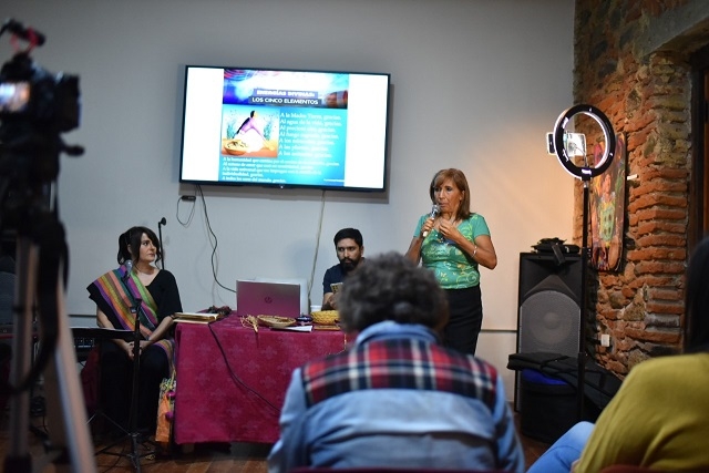 El conversatorio tuvo la participación de la propuesta musical de Sandra Warmi Sosa, junto al pianista Enrique Loyola y el percusionista Gastón Kaen, quienes interpretaron obras del Cantoral Calchaquí sobre lo divino y lo humano de Aníbal Albornoz Ávila.