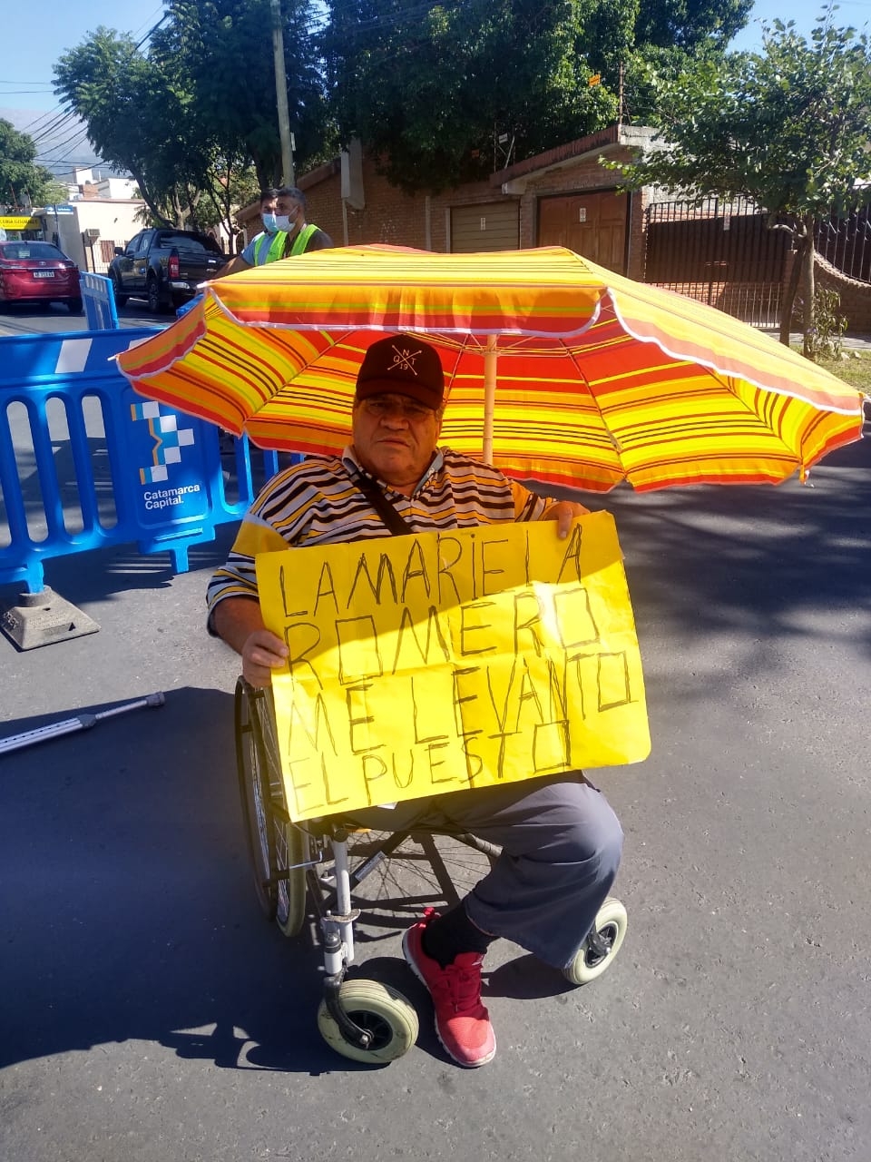 A Eliás le falta una pierna, carga una bolsa de colostomía y se traslada en su silla de ruedas una vez por semana a las intersecciones de las avenidas Illia y Nieva y Castilla, frente la sede municipal, y se instala bajo una sombrilla para reclamar que le devuelvan su puesto de comida que se lo quitaron hace un año cuando comenzaron los trabajos de refacción en la Plaza de la Estación.