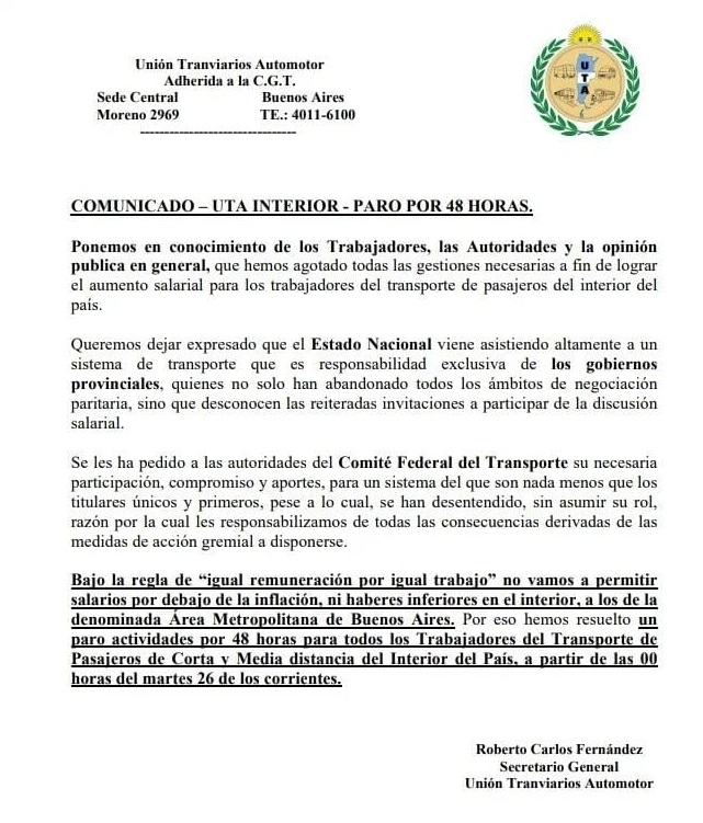 La Unión Tranviarios Automotor (UTA) comunicó en la tarde de este jueves el inicio de un paro de actividades por 48 horas a partir del 26 de abril debido a la falta de respuesta al reclamo de aumento salarial para los trabajadores del interior del país.