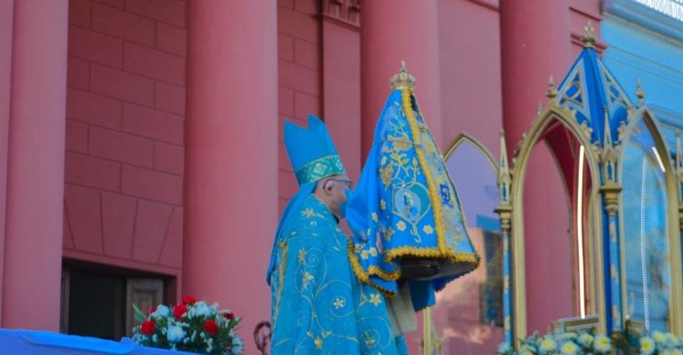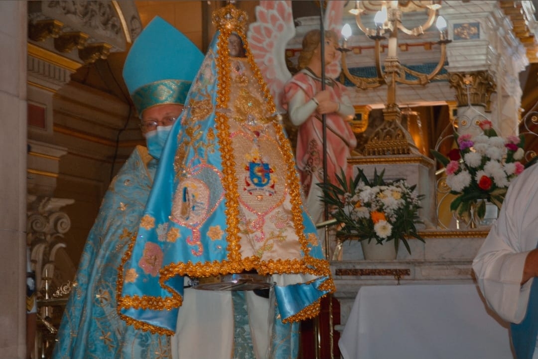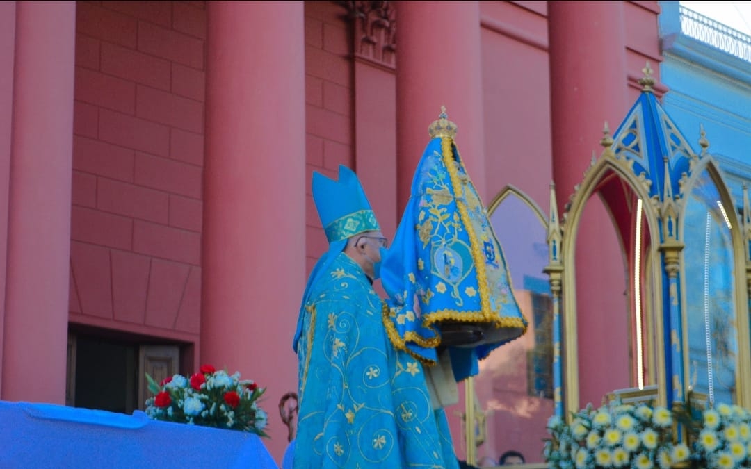 La tradicional ceremonia fue presidida por el obispo diocesano, Mons. Luis Urbanc, quien trasladó en brazos a la bendita Imagen, acompañado por sacerdotes del clero diocesano, hasta el atrio de la Catedral Basílica y Santuario mariano.