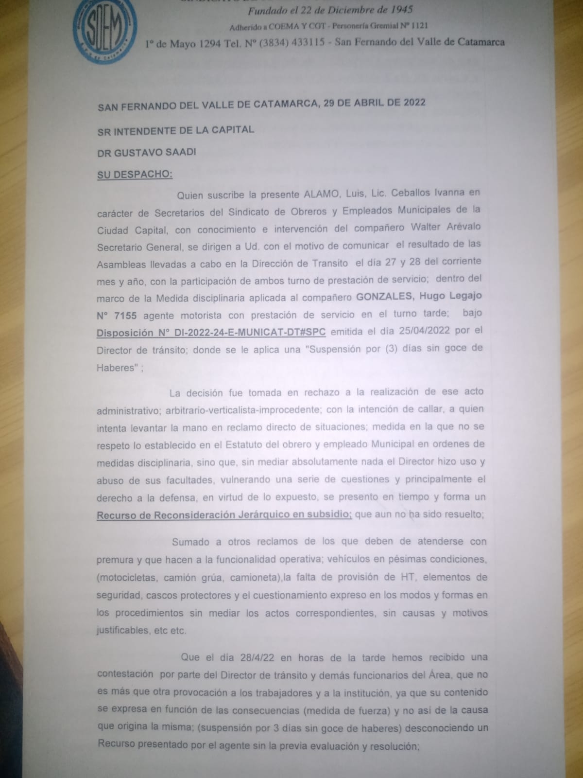 El gremio SOEM informó que convocó a un paro de actividades para el 1 de mayo sin asistencia a los lugares de trabajo, en repudio a la suspensión de tres días sin goce de haberes impuesta a un trabajador del área de Tránsito.