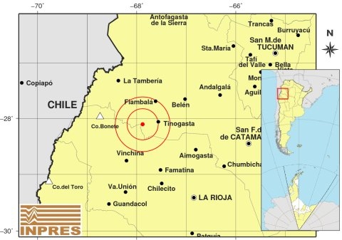 Epicentro: 177 km al NO de La Rioja; 213 km al O de San F. Del Valle De Catamarca; 32 km al O de Tinogasta -28.105 (lat) -67.880 (long)