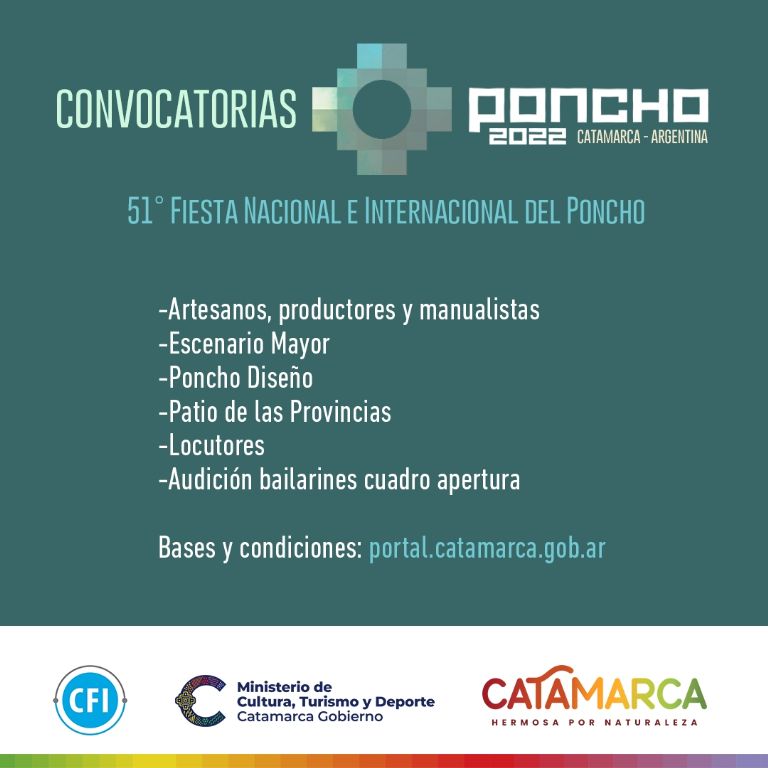 Para conformar el ballet que representará el cuadro de apertura de la 51° Fiesta del Poncho se realizará un proceso de selección mediante audición de bailarinas y bailarines catamarqueños, mayores de 16 años, con conocimientos en danzas del repertorio tradicional catamarqueño (zamba, chacarera, huella, valseado, carnavalito, pericón, triunfo, malambo, etc.), danza clásica y contemporánea.