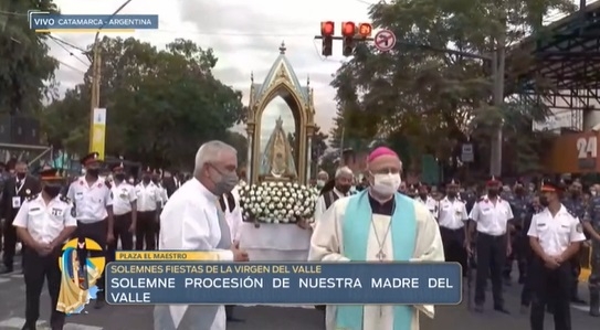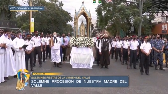 Alrededor de las 17.00 comenzó el paso de los grupos delante de la Sagrada Imagen, tras lo cual se dispuso la ubicación de las religiosas y religiosos, sacerdotes del clero local y de otras diócesis, y el obispo diocesano, Mons. Luis Urbanc, para dar inicio a la Solemne Procesión con la Santísima Madre del Valle escoltada por la Guardia de Honor de Bomberos. Detrás se ubicaron las autoridades provinciales encabezadas por el gobernador, Raúl Jalil; los intendentes de Capital, Gustavo Saadi, y de Fray Mamerto Esquiú, Guillermo Ferreyra; legisladores nacionales, provinciales y municipales, autoridades judiciales y de las fuerzas de seguridad.