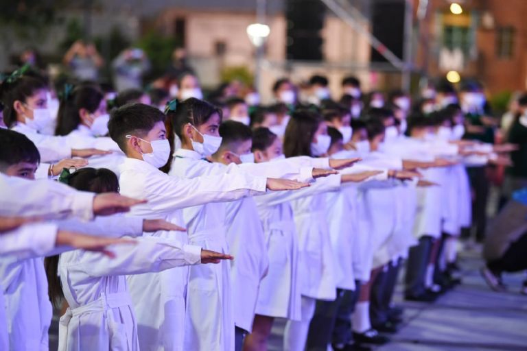 Llegó el momento cúlmine de la ceremonia, frente a un engalanado Palacio municipal, cuando se les preguntó a los estudiantes: “¿Prometéis respetar y hacer respetar los derechos, deberes y garantías que la Constitución Nacional establece, hacer todo lo que esté a vuestro alcance para cumplir y hacer cumplir sus preceptos y disposiciones, y respetar la autoridad de las Instituciones que de ella emanan?”.