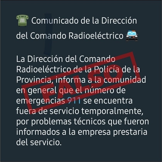 El Ministerio de Seguridad de la Provincia desmiente la información "falsa" que circula en redes sociales sobre que, el número de emergencia 911 se encuentra fuera de servicio.