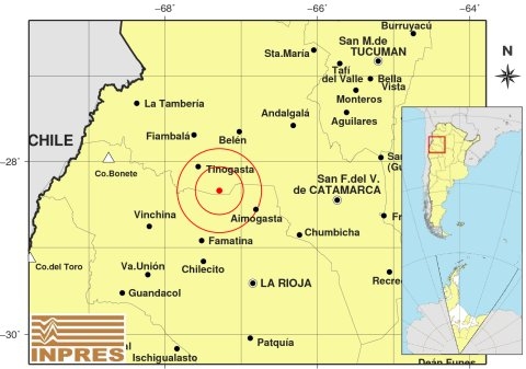 Epicentro: 126 km al N de La Rioja; 152 km al O de San F. Del Valle De Catamarca; 41 km al SE de Tinogasta -28.341 (lat) -67.286 (long)