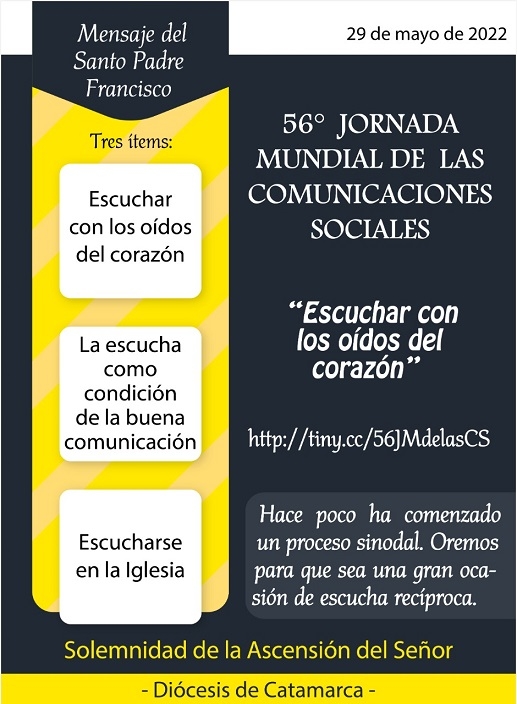 Este año, el mensaje del Papa Francisco está centrado en “Escuchar con los oídos del corazón”. Al comienzo del mismo, Su Santidad expresa: “El año pasado reflexionamos sobre la necesidad de “ir y ver” para descubrir la realidad y poder contarla a partir de la experiencia de los acontecimientos y del encuentro con las personas. Siguiendo en esta línea, deseo ahora centrar la atención sobre otro verbo, “escuchar”, decisivo en la gramática de la comunicación y condición para un diálogo auténtico”.