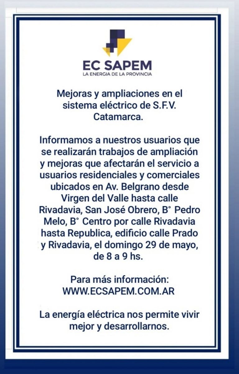 Por otra parte, se informó un corte que afectará el servicio a usuarios residenciales y comerciales ubicados en Av. Belgrano desde Virgen del Valle hasta calle Rivadavia, San José Obrero, B° Pedro Melo, B° Centro por calle Rivadavia hasta Republica, edificio calle Prado y Rivadavia, el domingo 29 de mayo, de 8 a 9 hs.