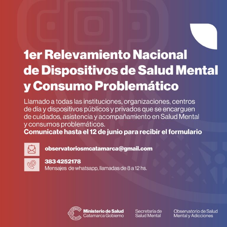 En este marco, la directora del Observatorio de Salud Mental y Consumo, Verónica Forner, remarcó que “es la primera vez que se lleva a cabo, este trabajo, pero es muy importante conocer cómo cada provincia puede responder a las demandas de salud mental y consumo, por esto es muy importante que todos los centros, ONG, etc., que sientan que trabajan en estas problemáticas nos contacten para incorporarlos al listado”. En este sentido, Forner indicó que las vías de contacto son: [email protected] o mensajes de texto y WhatsApp al 383-4252178, también se recibirán llamadas de 8 a 12 horas.