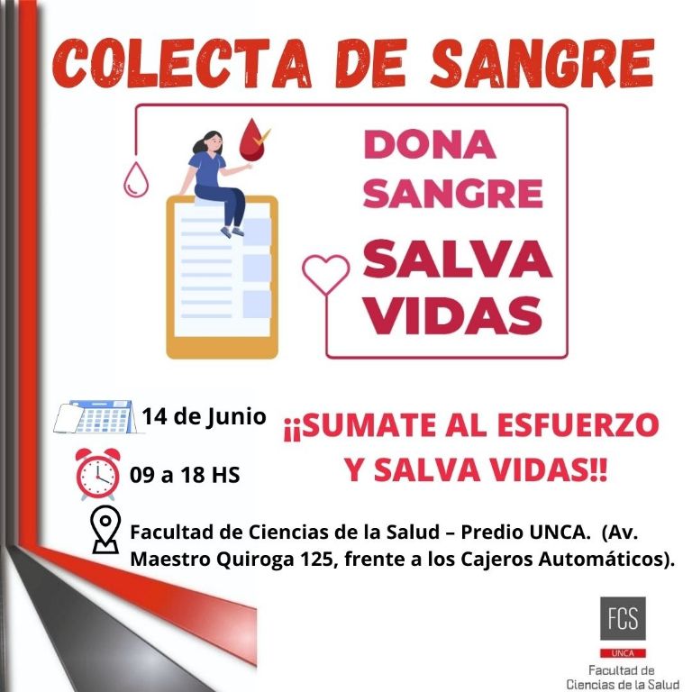 Maestro Quiroga 125, frente a los Cajeros Automáticos), en el horario de 09:00 a 18:00, hs. invitamos a toda la comunidad universitaria y la comunidad catamarqueña en general a participar y revalorizar su acción altruista, que le posibilita a la provincia contar y disponer con sangre de forma segura y oportuna, para ayudar a otras personas que lo necesiten.