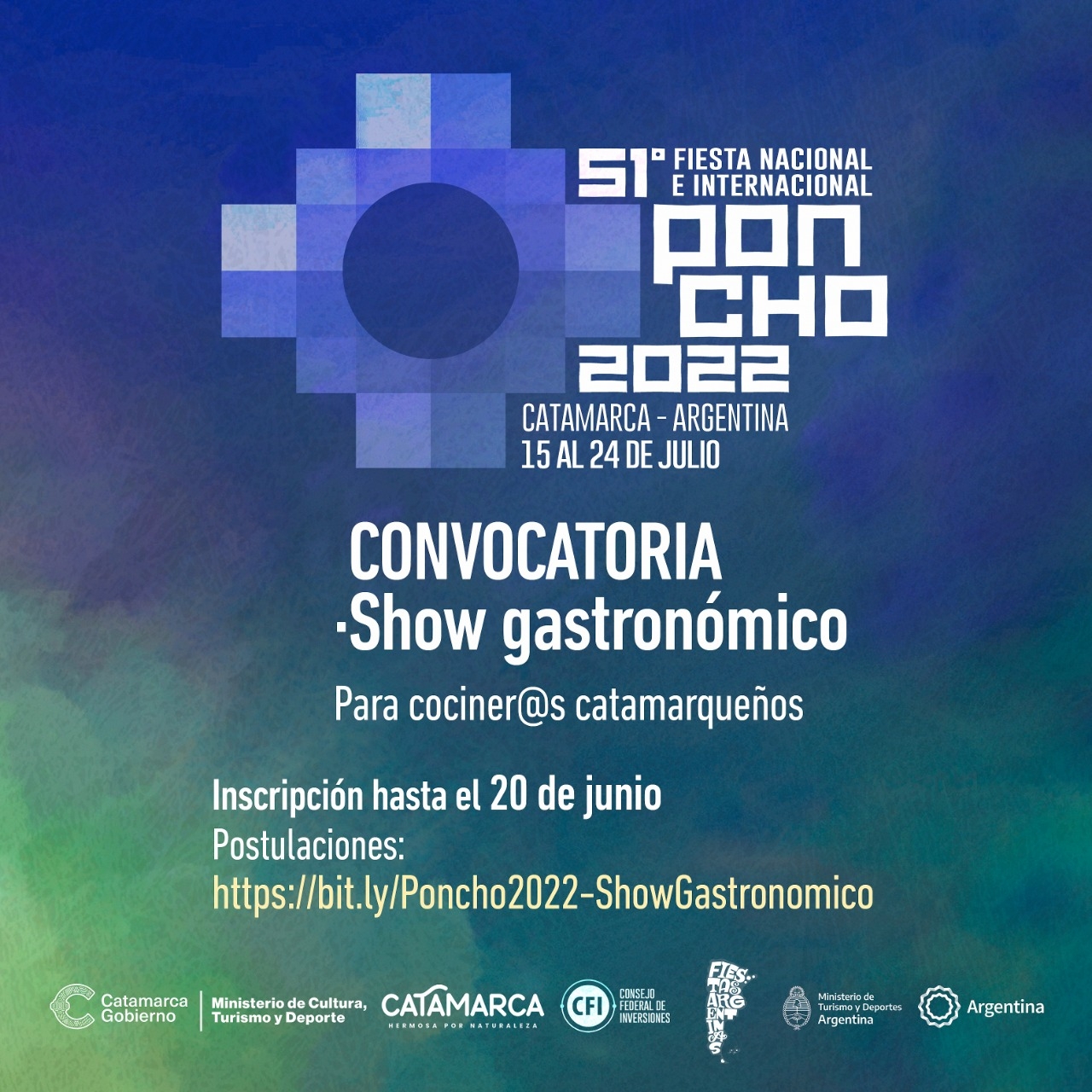 El Ministerio de Cultura, Turismo y Deporte, a través de la Secretaría de Gestión Turística, convoca a cocineras y cocineros catamarqueños certificados a postular sus propuestas para participar de los shows gastronómicos que se realizarán en el marco de la 51° Fiesta Nacional e Internacional del Poncho, que tendrá lugar del 15 al 24 de julio en el Predio Ferial.