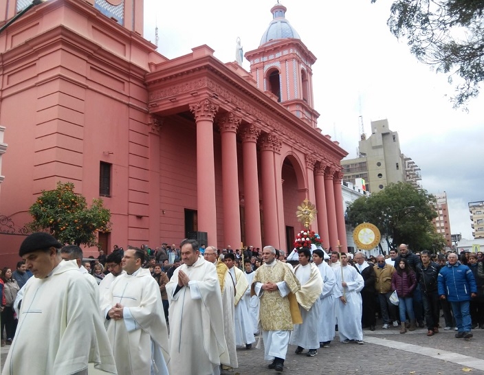 Finalizada la celebración eucarística, se llevará a cabo la procesión más importante del año llevando el Santísimo Sacramento. El recorrido comprenderá calles San Martín, Salta, República y Sarmiento, finalizando en el Paseo de la Fe.