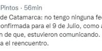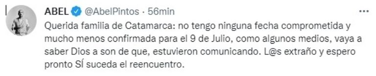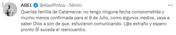 "Querida familia de Catamarca: no tengo ninguna fecha comprometida y mucho menos confirmada para el 9 de Julio, como algunos medios, vaya a saber Dios a son de que, estuvieron comunicando. L@s extraño y espero pronto SÍ suceda el reencuentro", posteó en la red social.
