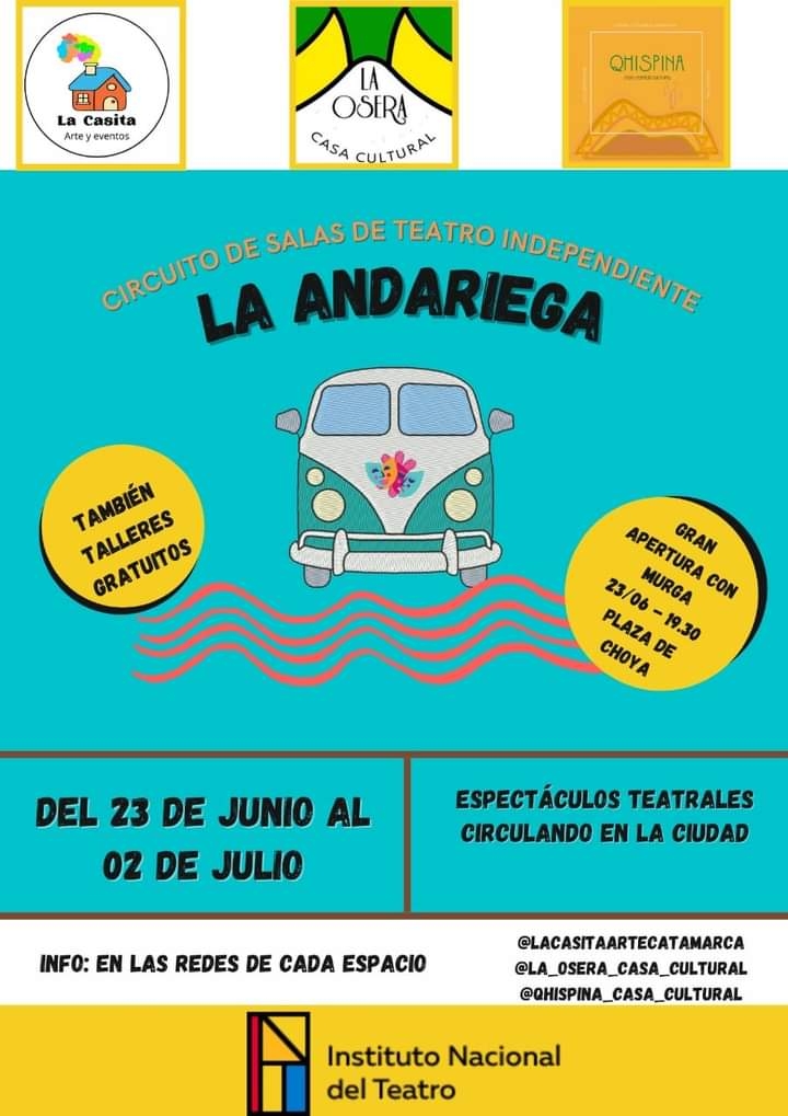 Continúa el “CIRCUITO DE SALAS DE TEATRO INDEPENDIENTE LA ANDARIEGA" que se lanzara este 23 de junio. Se trata de un Ciclo de funciones y talleres teatrales en los que las actividades girarán por la Ciudad en distintos Espacios Culturales y Salas Independientes.
