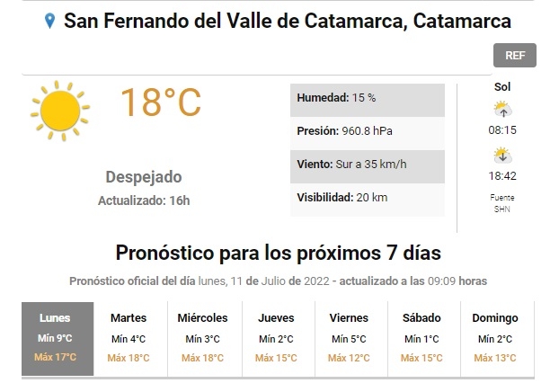 Segun el pronóstico extendido del Servicio Meteorológico Nacional, el viernes en la primera jornada del festival mayor de los catamarqueños, la máxima sería de tan solo de 12° y una mínima de 5°.