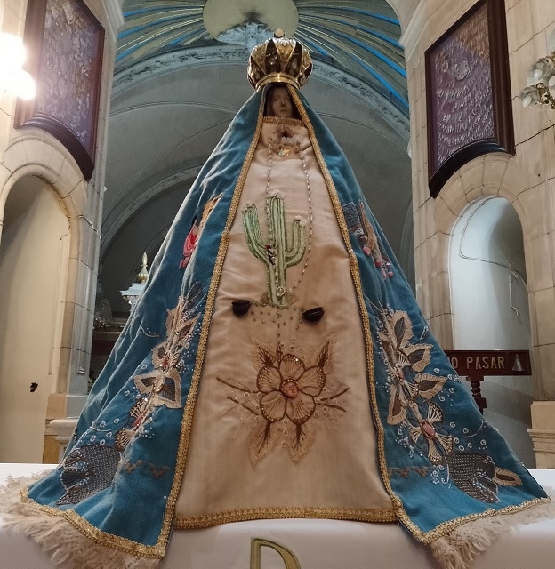 La ceremonia de cambio de manto se llevó a cabo en la noche del jueves 14, en el Camarín de la Catedral Basílica y Santuario mariano, con la presencia del rector, el padre Gustavo Flores; y las autoras de la prenda: Graciela del Valle de Carrizo y la artesana Guillermina Zárate.