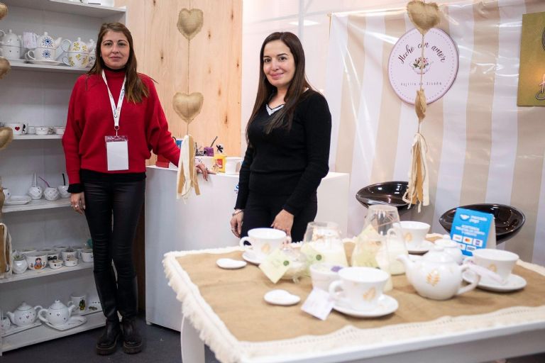 El stand de Eleonora y Judith Rodríguez combina los emprendimientos de cada una. Hecho con amor (@hechoconamor_vajillaexclusiva) es un emprendimiento de vajilla de cerámica y vidrio que también ofrece el servicio de desayunos sorpresa. En sus inicios comenzó como venta ya esmaltada y luego el emprendimiento incorporó el horno y comenzó a producir. Entre los objetos se observan tazas con patitas, bandejas, platos, cuencos, azucareras, teteras, mates, juegos de té, chops, cerealeros, tazones soperos, y bowls. Horneadas a 800 grados, las piezas son luego ilustradas con calcos vitrificables que se adhieren también con calor.