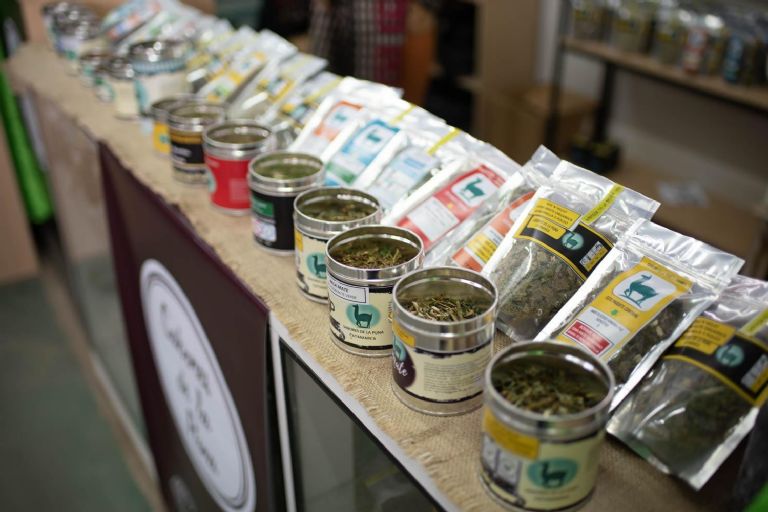La ruta de los sabores comienza en el stand de los yuyitos de “Sabores de la Puna”, donde además ofrecen productos innovadores como los palitos saborizados para el mate y la yerba negra que realizan con un proceso de tostado ancestral llamado tatemado. Esta yerba es versátil porque puede combinarse con otras yerbas, té e incluso con las salsas.
