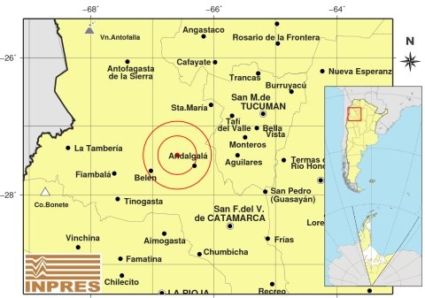 Epicentro: 141 km al NO de San F. Del Valle De Catamarca; 154 km al SO de San Miguel De Tucumán; 33 km al NO de Andalgalá -27.426 (lat) -66.596 (long)