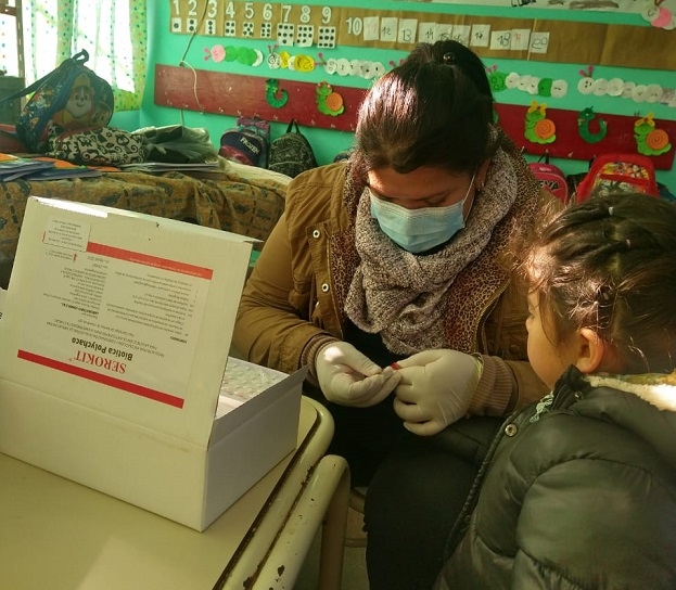 La muestra se toma por punción del dedo; en el caso de los niños de acuerdo a los requisitos de la libreta sanitaria infanto juvenil. Además, es obligatoria la realización y notificación del diagnóstico a toda persona gestante durante el embarazo, en el caso de resultar positivo el análisis, también debe ser diagnosticado el bebe.